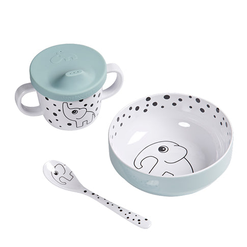 サイズ | ボウル:Ø13.5 × 5cm カップ:Ø8 × 6.5cm スパウト蓋:Ø8 × 2cm スプーン:14cm パッケージ:15 × 13.5 × 8.5cm |