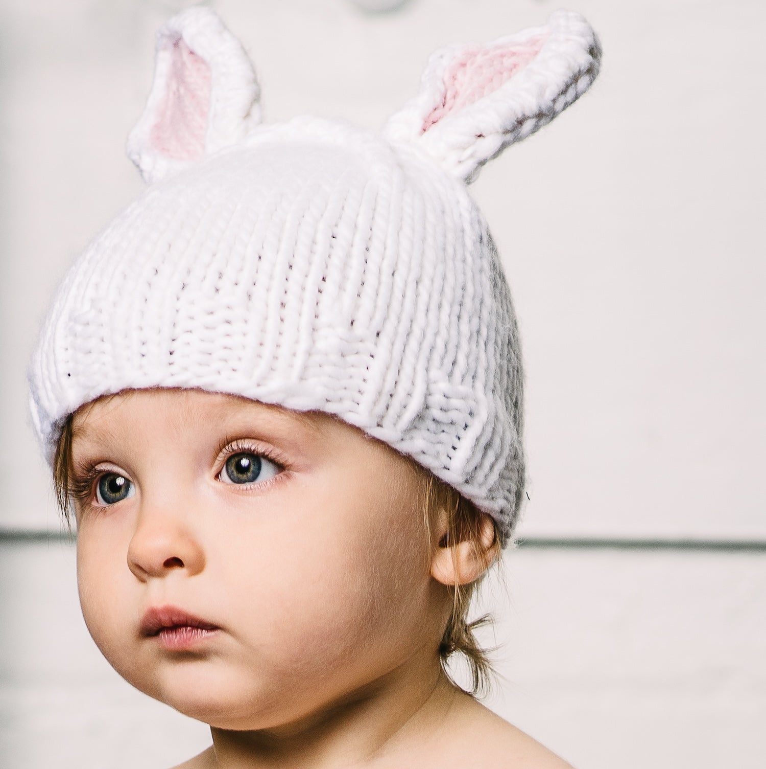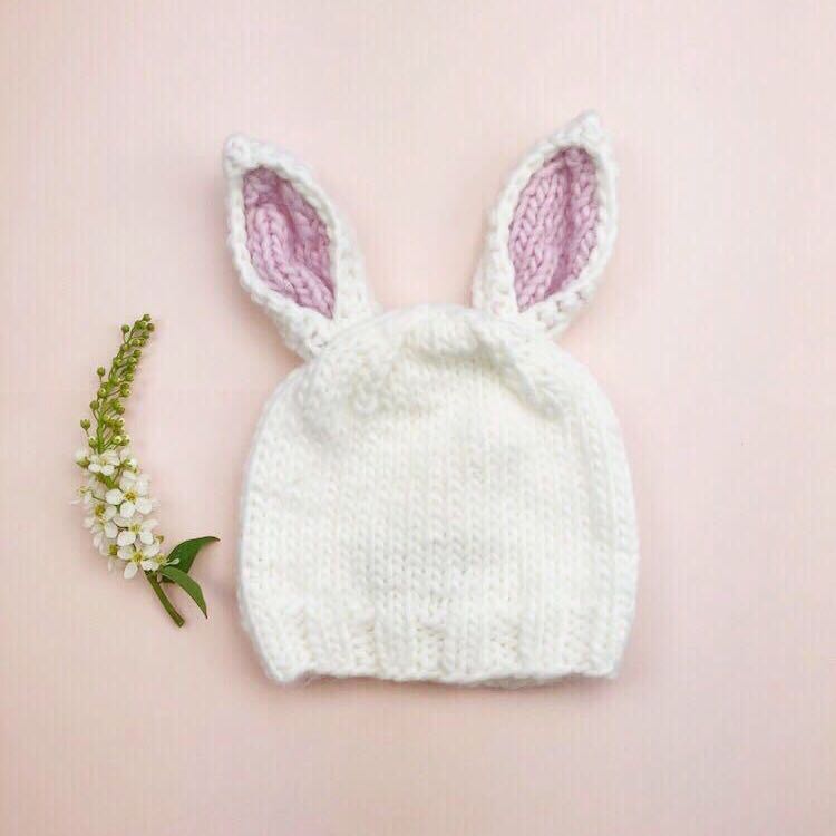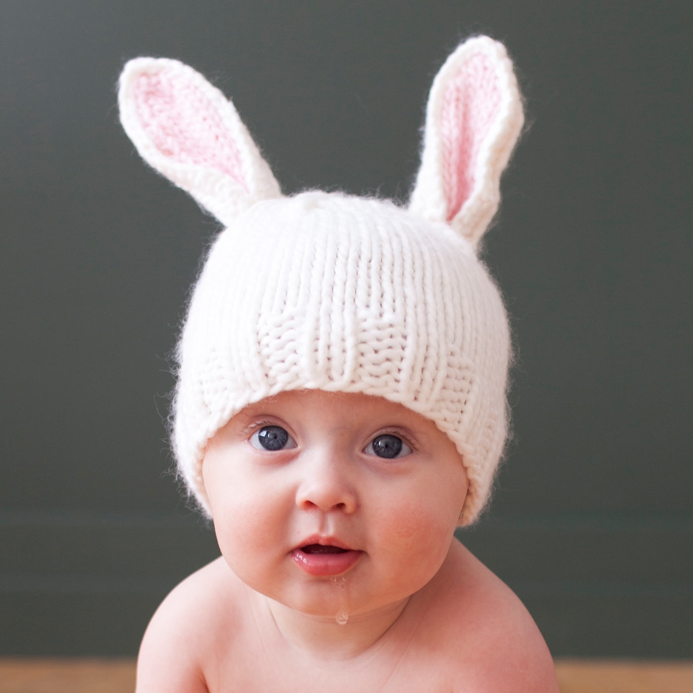うさぎの耳がついた帽子をかぶった赤ちゃんは、文句なしのかわいらしさ。お子様の雰囲気に合わせて、3色からお選びいただけます。