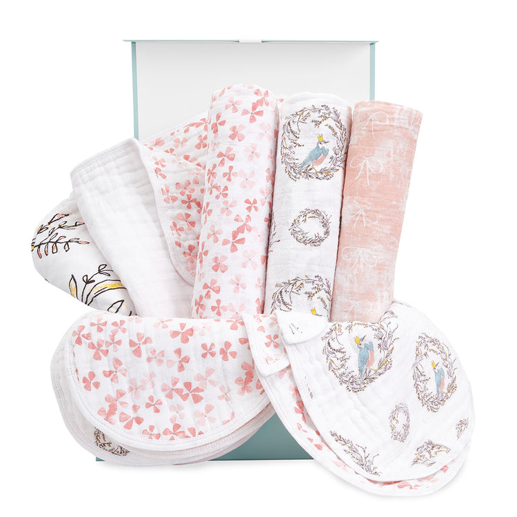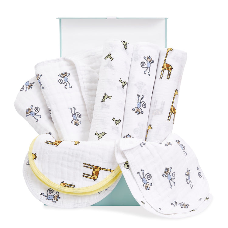 サイズ | スワドル:約120cmx120cm スナップビブ:約32 x 24cm バーピービブ:約56 x 20cm ドリームブランケット:約120cmx120cm パッケージサイズ:約30.5cm x 30.5cm x 14cm |