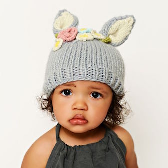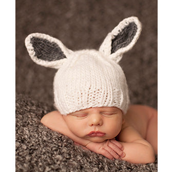 うさぎの耳がついた帽子をかぶった赤ちゃんは、文句なしのかわいらしさ。お子様の雰囲気に合わせて、3色からお選びいただけます。