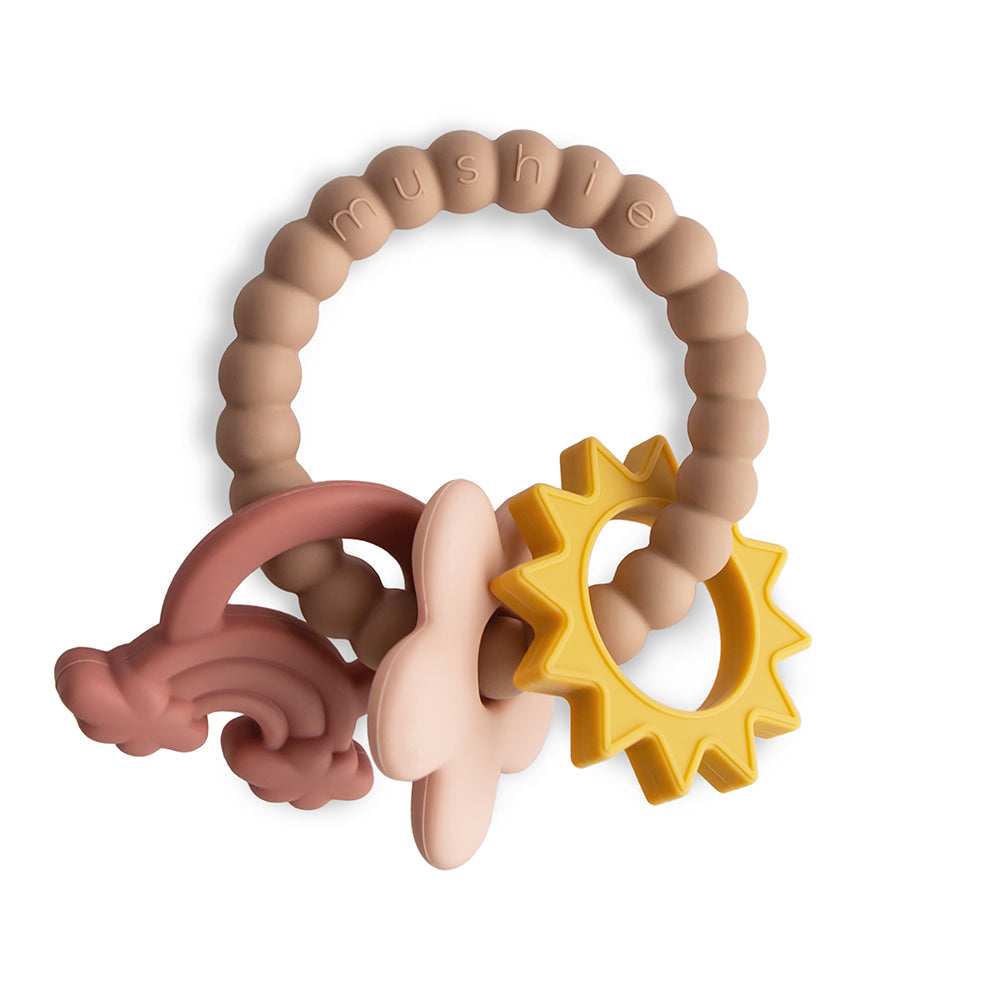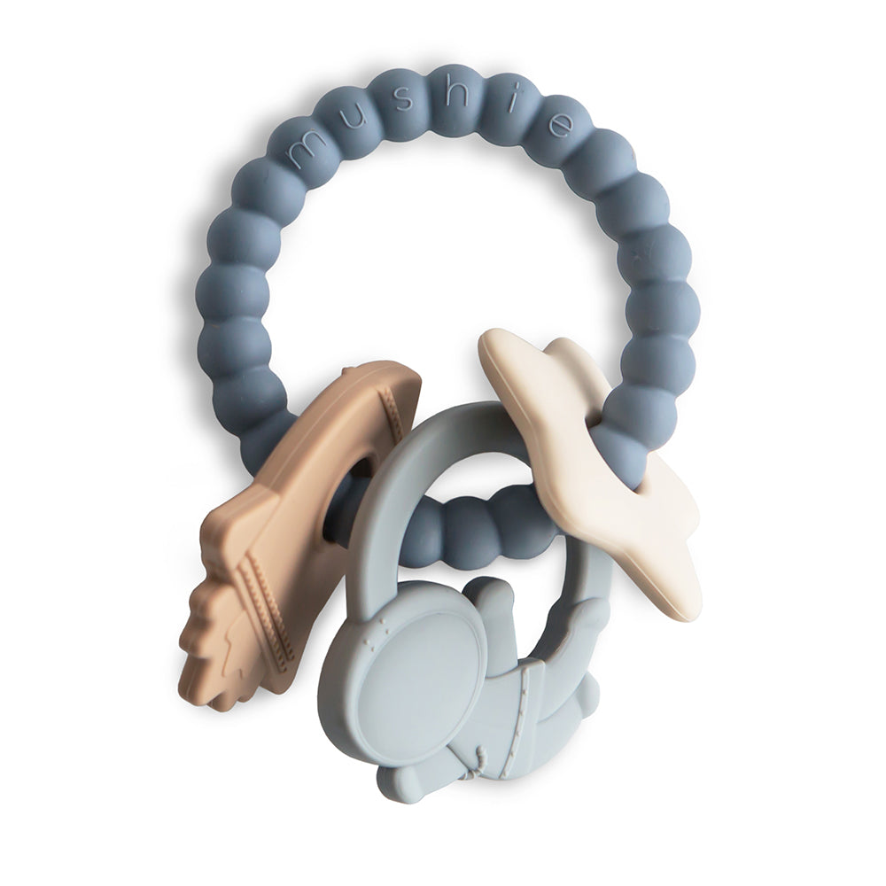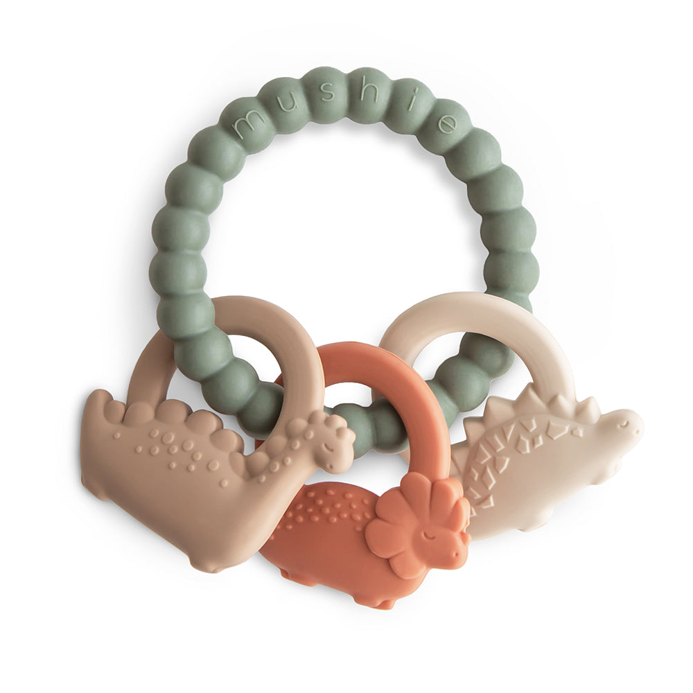 3つのモチーフがついたリング型の歯固め。「恐竜」「宇宙」「自然」の3種類のデザインがあります。