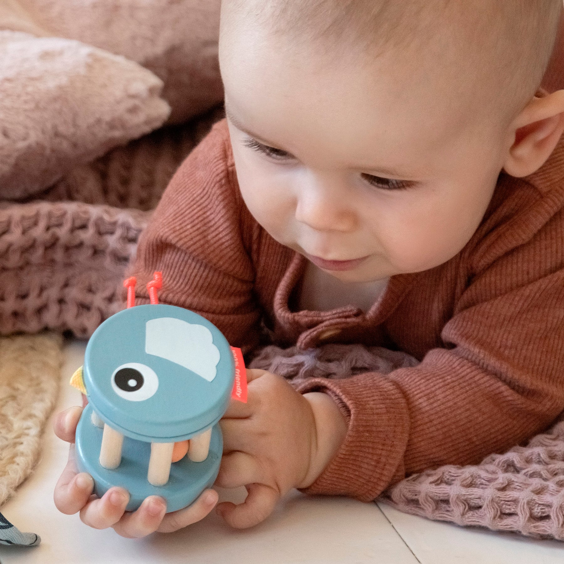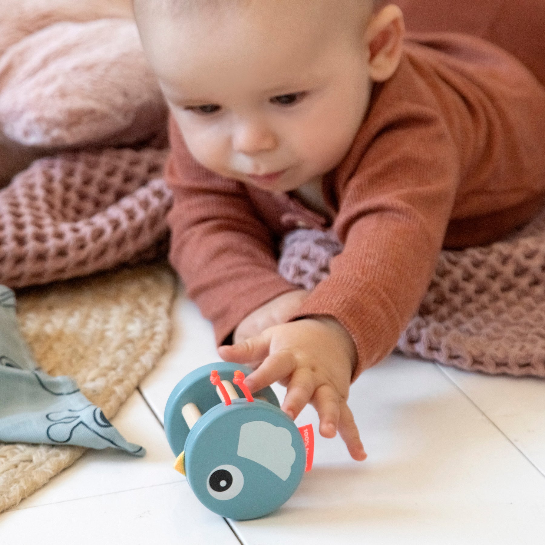 そんな“タミータイム”を充実させるこのトイは、転がしたり振ったりするたびに木の音が心地よく響く木製ラトルです。