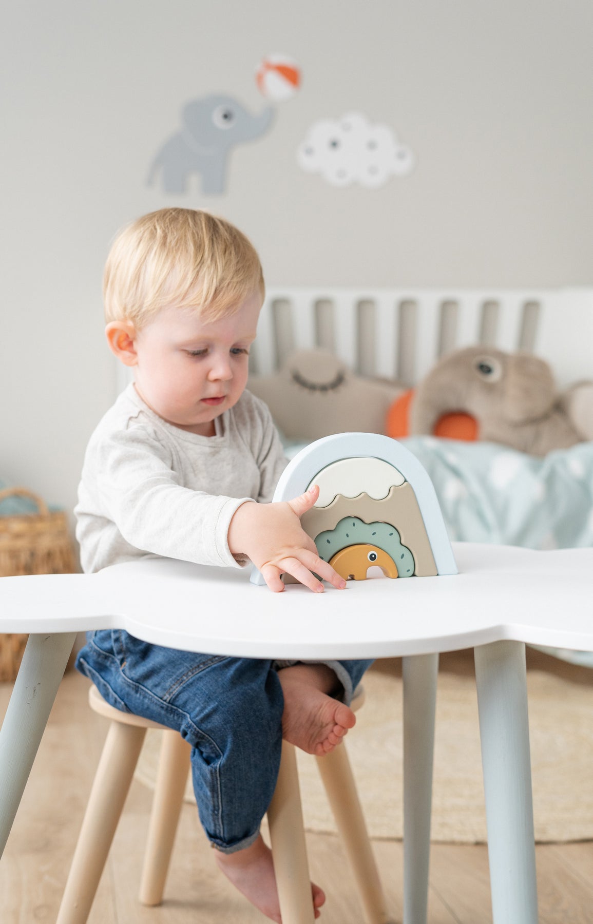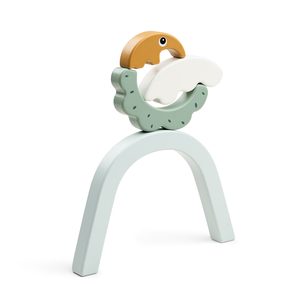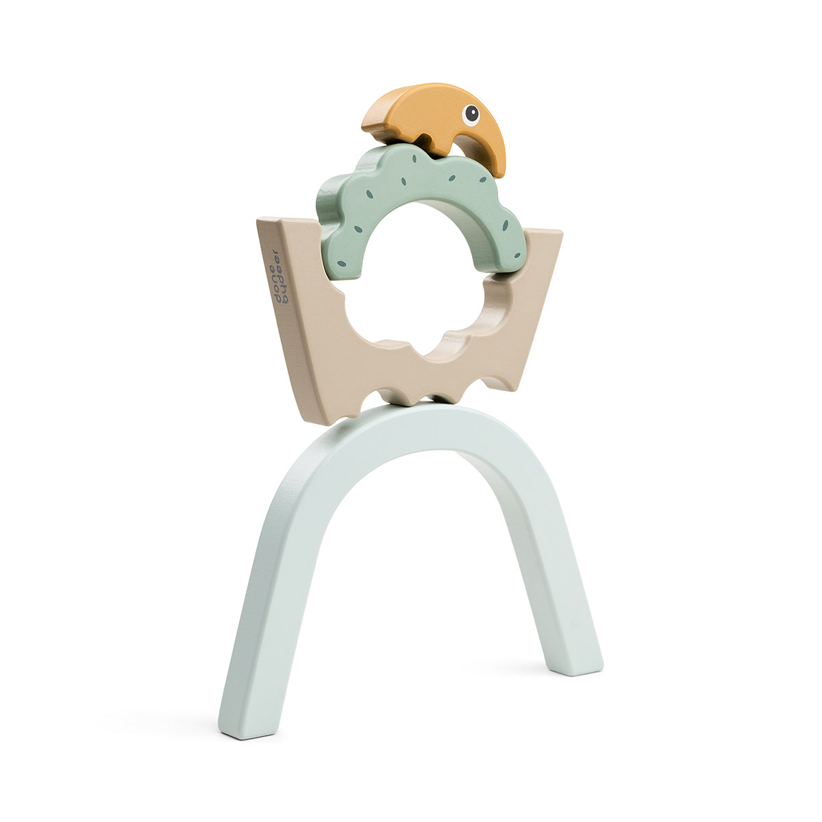 積み木やバランス遊びを通して想像力を育む5ピースの木製トイです。