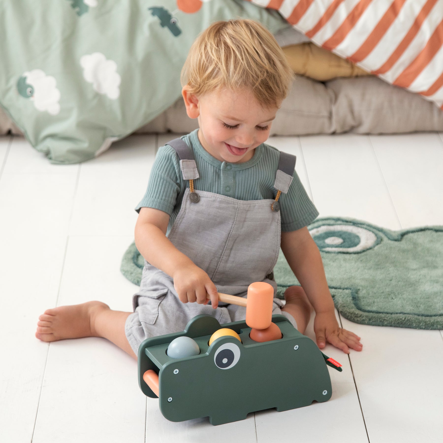 クロコの背中の3色ボールをハンマーで叩いて中に落とす木製トイです。