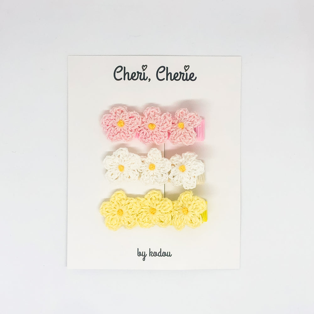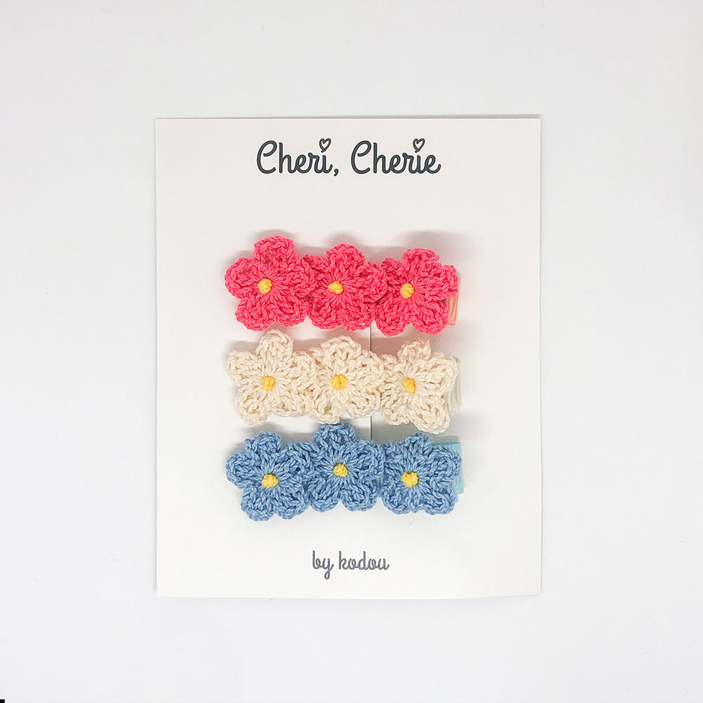 小ぶりなフラワーのクリップ。1本だと控えめ、重ねづけで華やかに。違った表情が楽しめるセットです。