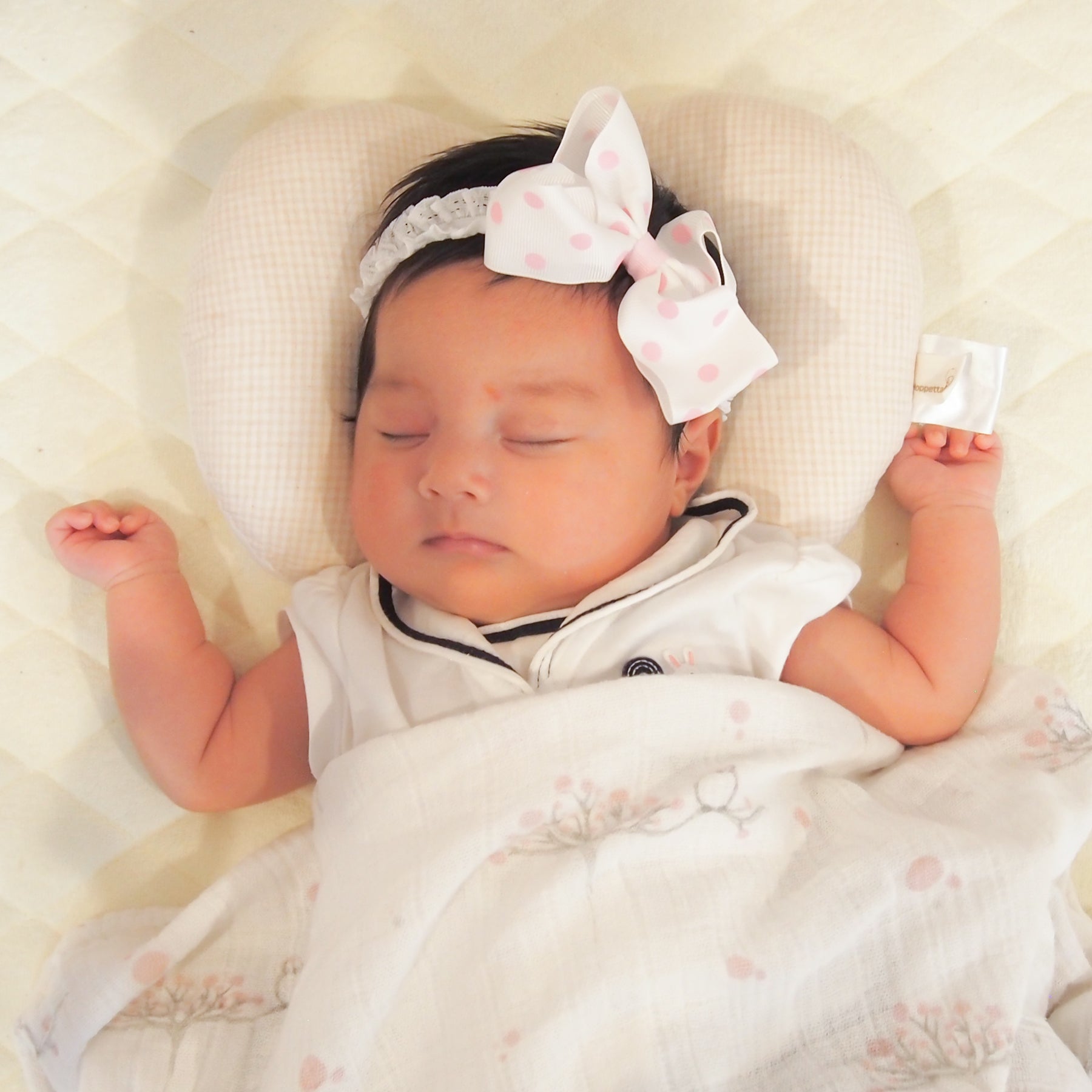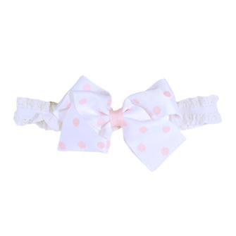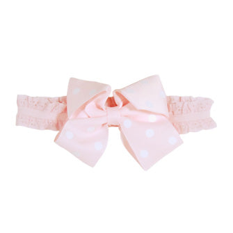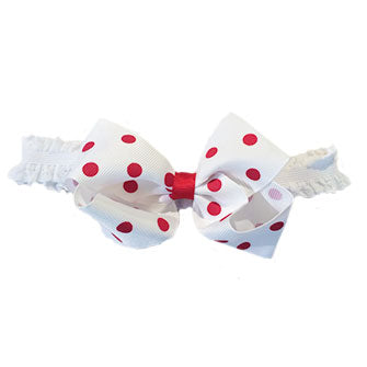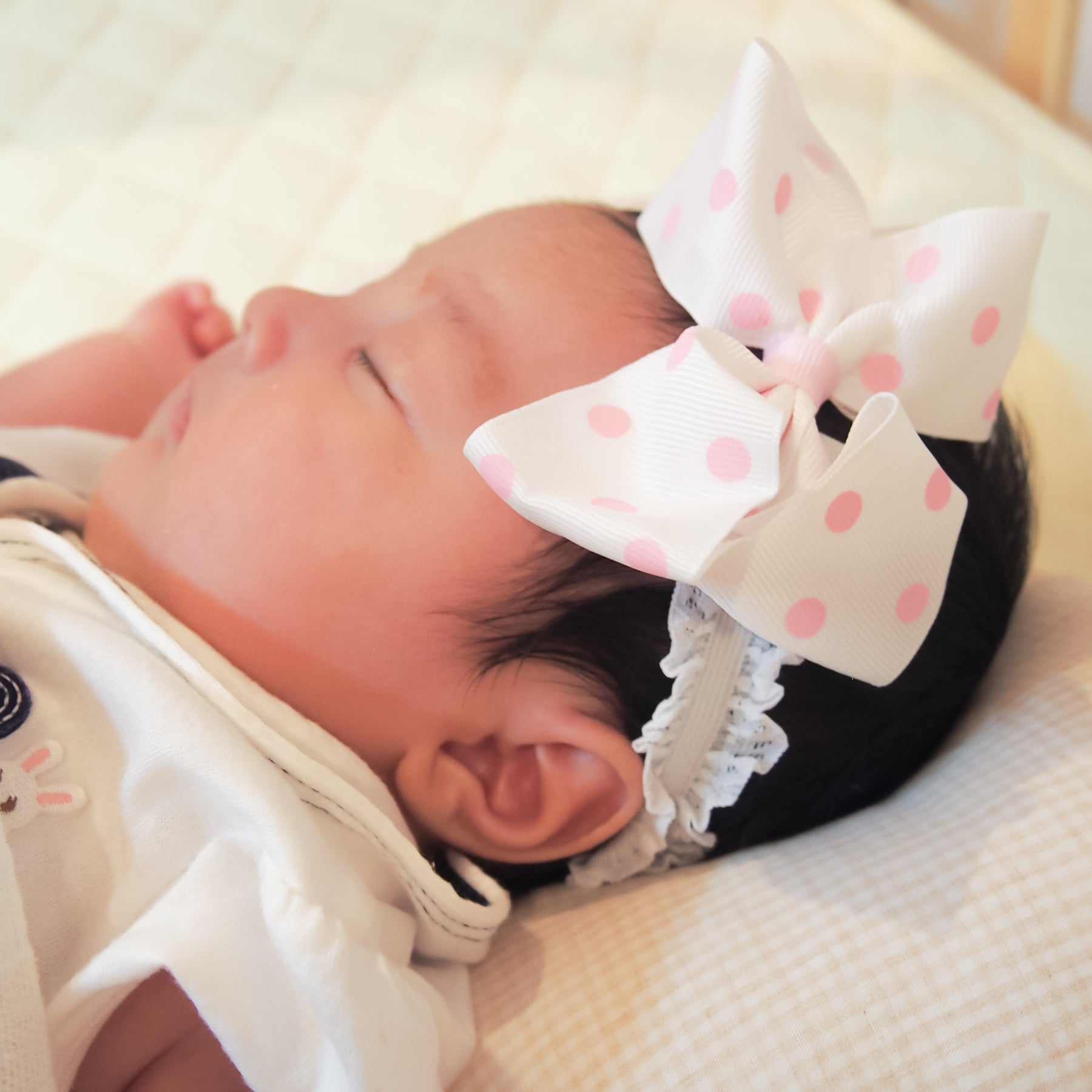 大きいリボンの付いたヘアバンド。ドット柄のビッグリボンで一気に主役級。