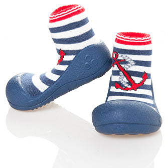 靴下と靴がつながったデザインがユニークなアティパスのシューズ。 つま先の広い設計や屈曲性の高さなど、科学的データに基づいたデザインが赤ちゃんの歩行トレーニングをやさしくサポートしてくれます。