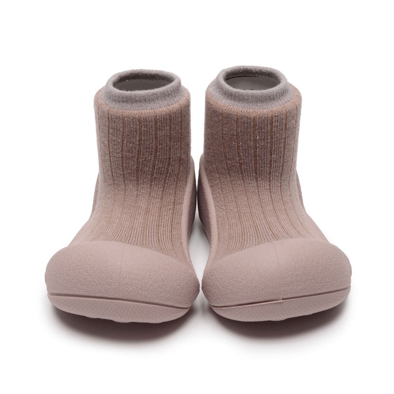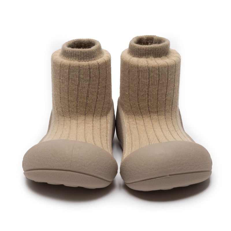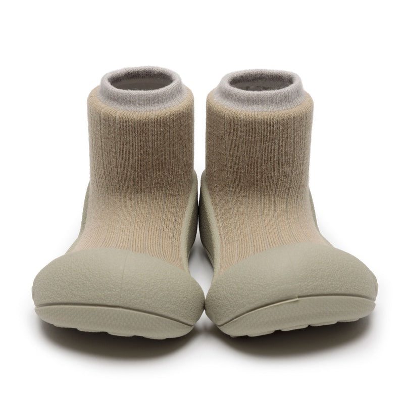 靴下と靴がつながったデザインがユニークなアティパスのシューズ。 つま先の広い設計や屈曲性の高さなど、科学的データに基づいたデザインが赤ちゃんの歩行トレーニングをやさしくサポートしてくれます。
