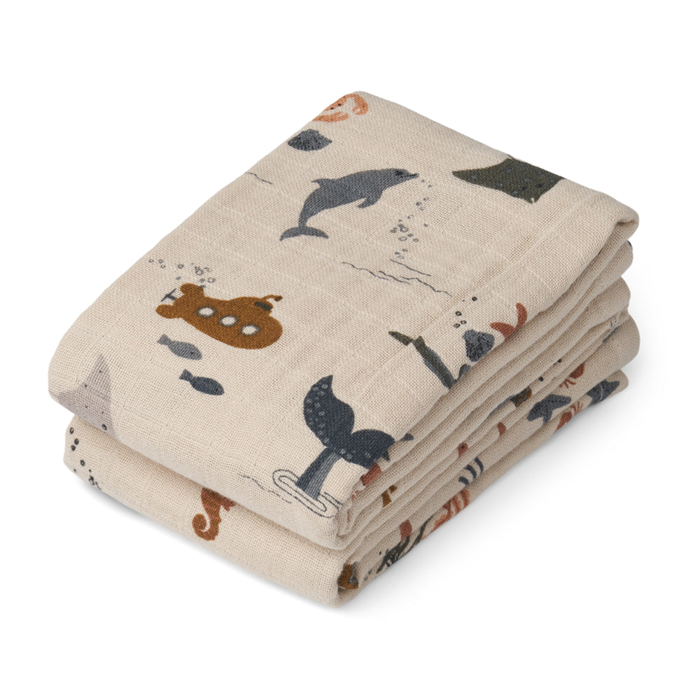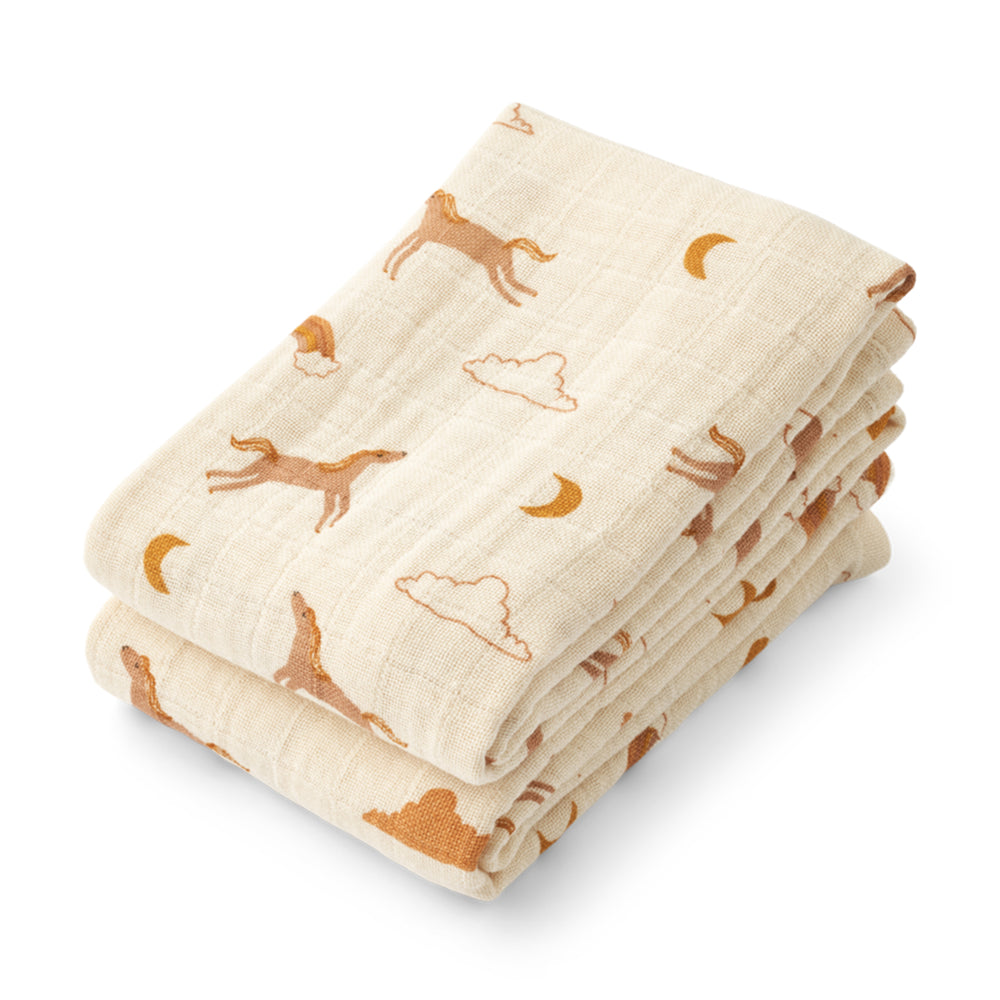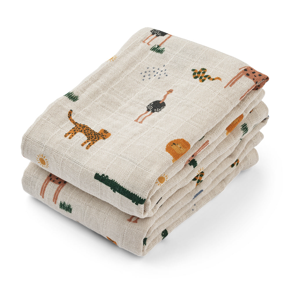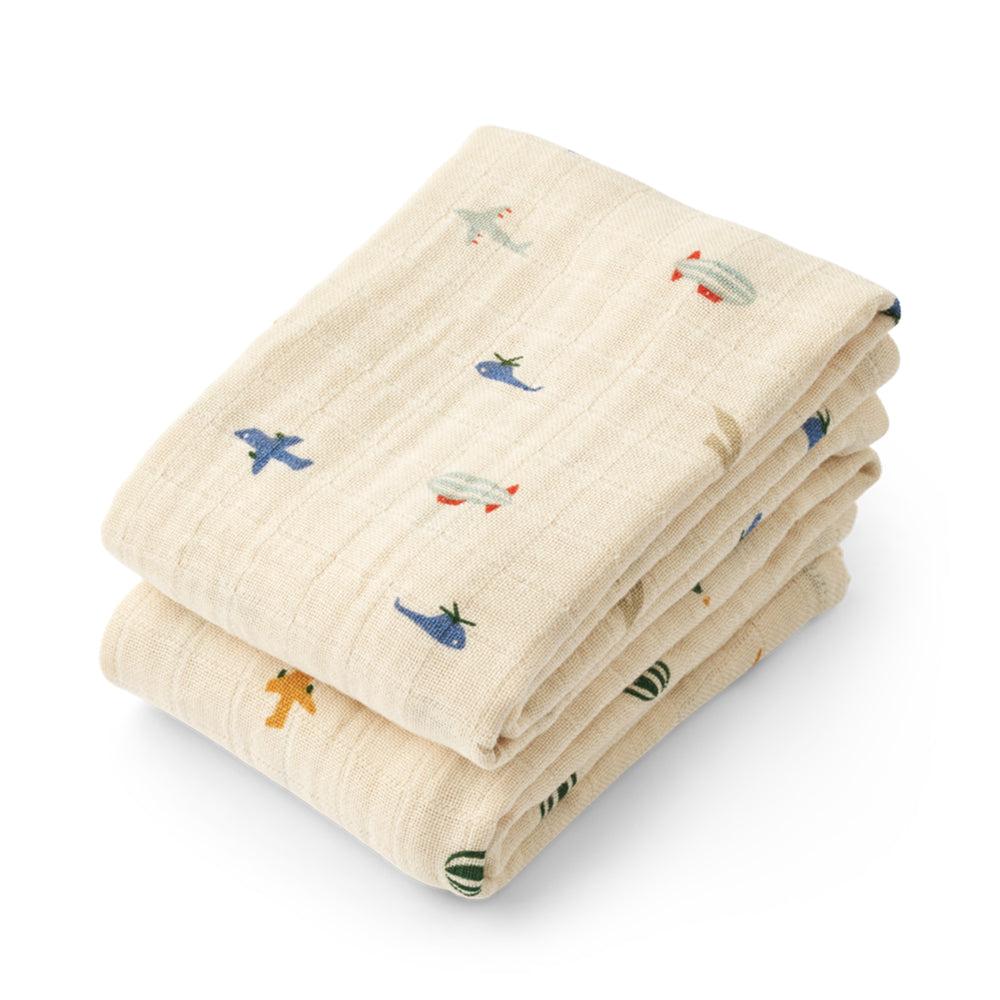 リーウッドらしい遊び心のある可愛い柄をプリントしたガーゼおくるみの2枚セット。