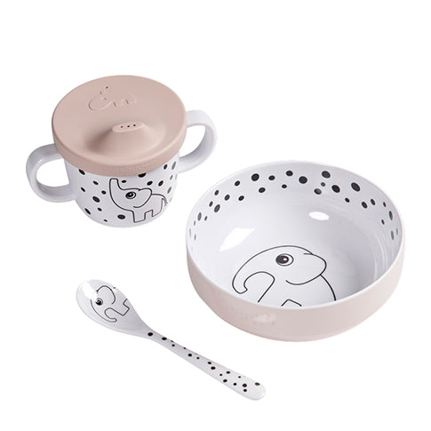 | サイズ | ボウル:Ø13.5 × 5cm カップ:Ø8 × 6.5cm スパウト蓋:Ø8 × 2cm スプーン:14cm パッケージ:15 × 13.5 × 8.5cm |