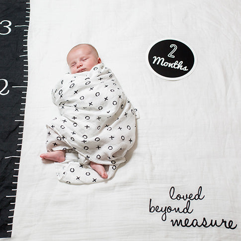 日々の成長が一目でわかる、メジャー付きのおくるみ。モノトーンだから、大人っぽいお部屋にもぴったりです。