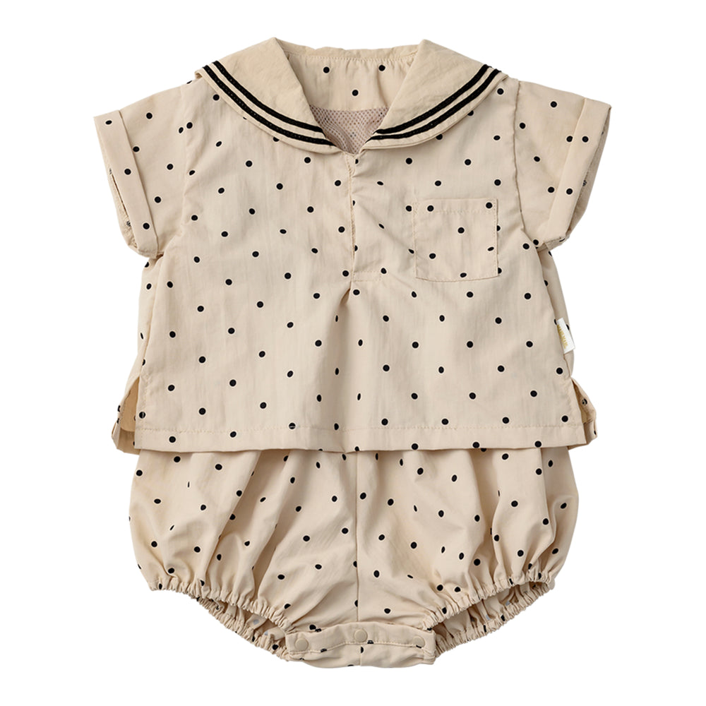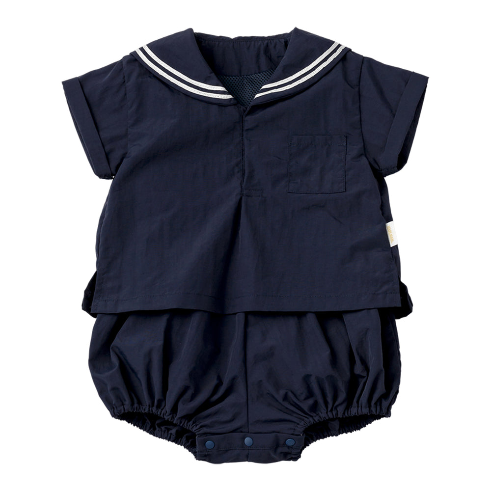 セーラーカラーからヒントを得た襟ぐりとラインがワンポイント。ベビーならではの丸いフォルムを引き立てるブルマロンパース型もポイントで、セーラー服が持つ格式高さとベビーの愛らしさを兼ね備えています。