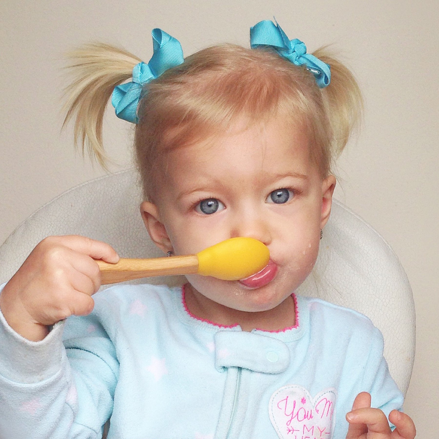 竹の柄は、子どもにも大人にも握りやすい形状に。スプーンの先のシリコンは、生え揃わない歯や歯茎にやさしく、食べ物がすくいやすい形状に仕上げました。